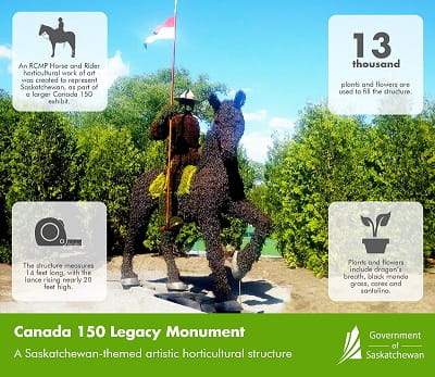 The Saskatchewan-themed work of art is a depiction of a Royal Canadian Mounted Police (RCMP) Officer dressed in Red Serge, on a horse. The structures were designed to reflect the values, culture and arts associated with each Canadian province and territory.