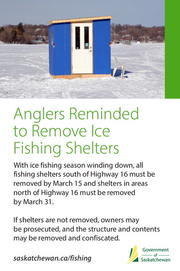 With ice fishing season winding down, all fishing shelters south of Highway 16 must be removed by March 15 and shelters in areas north of Highway 16 must be removed by March 31.