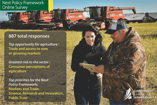 An online consultation on Saskatchewan’s priorities for the Next Policy Framework (NPF) has wrapped up. The survey ran from November 14, 2016 - January 31, 2017 as part of preparations to replace Growing Forward 2 (GF2). GF2 is the current five-year, federal-provincial-territorial agricultural policy framework agreement which will expire in March 2018.