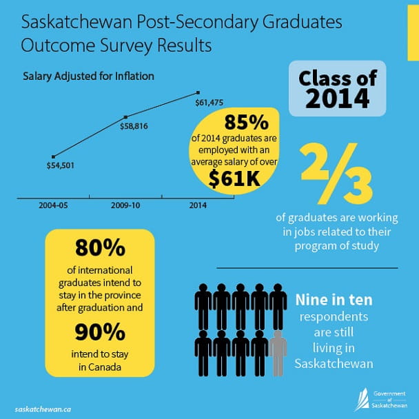 The Saskatchewan Graduate Outcomes Survey found that 85 per cent of Saskatchewan post-secondary graduates from the class of 2014 are employed, with an average annual salary of $61,475. Survey results also showed that graduate salaries have increased faster than the rate of inflation.
