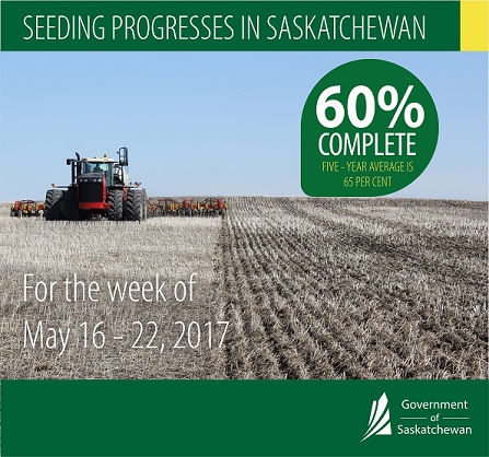 Seeding is advancing quickly in the province thanks to warm, dry weather. Producers now have 60 per cent of the provincial crop in the ground, according to Saskatchewan Agriculture’s Weekly Crop Report. The five-year (2012-2016) seeding average for this time of year is 65 per cent.