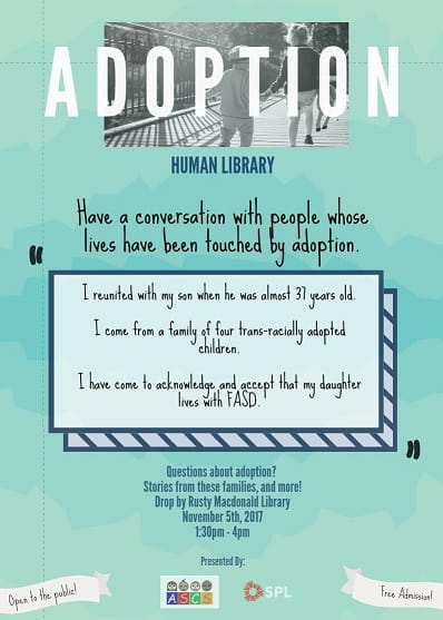 To celebrate Adoption Awareness Month, the Adoption Support Centre is hosting their second annual Human Library on Sunday, November 5 at Rusty MacDonald Library in Saskatoon from 1:30-4:30 p.m. Instead of pulling a book off the shelf, in a Human Library “Readers” get to have a conversation with human “Books” and learn new perspectives. This Human Library is focused specifically on personal adoption stories and perspectives.