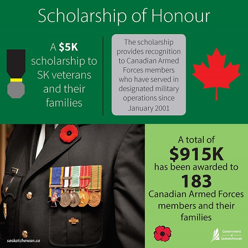 Since the scholarship was started in 2009, 183 scholarships have been awarded, totalling $915,000. Nineteen of these recipients are family members of injured or fallen Canadian Armed Forces Members. Eligible candidates must be current or former Saskatchewan residents. They must be returning service men and women who actively served in designated military operations in the Canadian Armed Forces (regular or reserves) after January 2001.