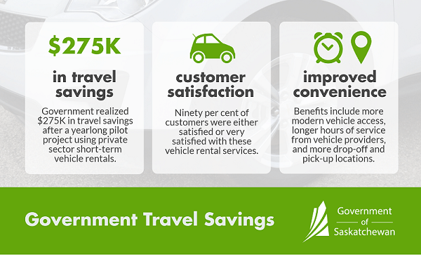 The one-year pilot project used rental vehicles from the private sector to fulfill government business needs for short-term travel required in Saskatoon, Prince Albert and North Battleford. It resulted in $275,000 in travel savings.