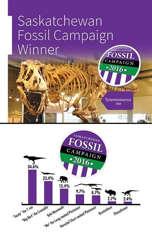 In 2016, the Royal Saskatchewan Museum’s (RSM) Saskatchewan Fossil Campaign held a video contest for schools, an exhibit and an in-person vote at the RSM, and an online poll allowing anyone across the province to vote for one of seven provincial fossil candidates. The results were announced in May of 2016, showing massive support for the T.rex.