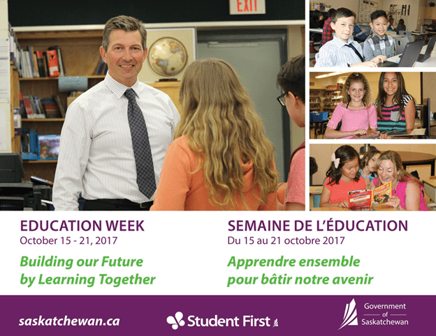 The Government of Saskatchewan has proclaimed October 15-21, 2017 as Education Week. This year’s theme, Building our Future by Learning Together, highlights the important role education plays in our province and the formative role of teachers.