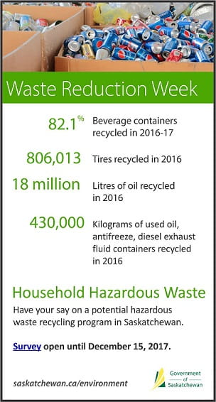 “As we celebrate and recognize Waste Reduction Week, we’re asking residents to provide feedback on a potential program that results in effective, successful and safe hazardous material recycling,” Duncan said. “This week is an opportunity for everyone in Saskatchewan to focus on recycling and reducing waste and we will continue to work to provide programming to accomplish this.”