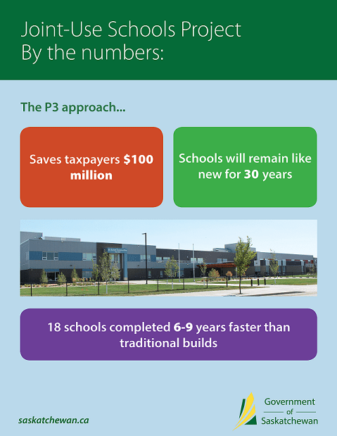 In Regina, the joint-use schools are located in Harbour Landing, Greens on Gardiner and Rosewood Park. The schools were constructed using public-private partnership (P3).