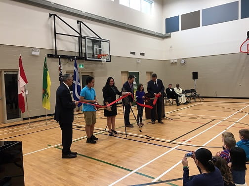 St. Lorenzo Ruiz Catholic School celebrated its grand opening today with an energetic gathering in the school gymnasium. Saskatoon University MLA Eric Olauson, on behalf of Education Minister Bronwyn Eyre, joined students to unveil the plaque that will be displayed in the school's entrance and cut the ribbon to officially mark the opening of the school.