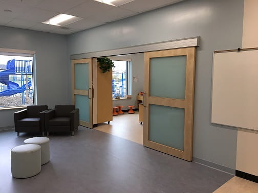 Like all 18 schools, St. Lorenzo Ruiz features flexible learning spaces that accommodate a variety of learning styles, such as sliding barn doors that can turn individual classrooms into larger multipurpose spaces, creating more room for programming. The spaces are bright and airy, and inspire creativity and collaboration among students and teachers.
