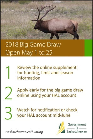 Detailed information about big game draw season and quotas is available at www.saskatchewan.ca/hunting.