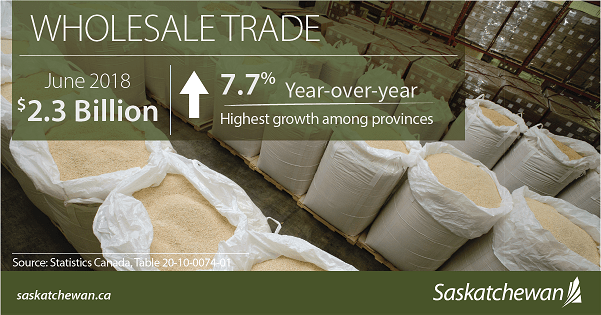 Saskatchewan’s June 2018 wholesale trade numbers increased by 7.7 per cent, compared to June 2017 (seasonally adjusted)—the highest percentage increase among Canada’s provinces and higher than the national average of 3.9 per cent.