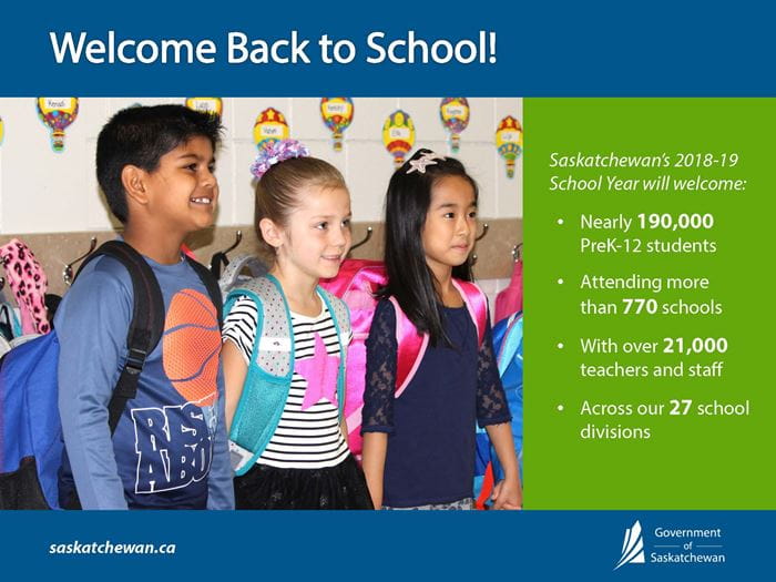 This fall, Saskatchewan schools will welcome nearly 190,000 Prekindergarten to Grade 12 students at more than 770 schools across our 27 public, separate and francophone school divisions, including associate schools.