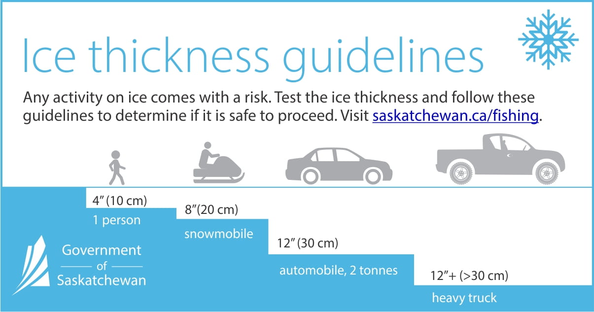 Anglers are reminded to use caution and common sense, and always put safety first when going out on frozen lakes. This includes testing the ice thickness before travelling on it. A minimum of 10 cm of good ice is required for walking and 30 cm for light vehicle travel. Wear warm clothing.