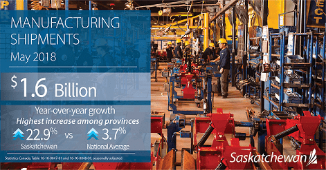 Manufacturing shipments for May 2018 were up 22.9 per cent over last May (seasonally adjusted), the highest percentage increase among the provinces and well ahead of the 3.7 per cent recorded nationally.