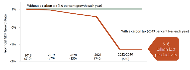 The Government of Saskatchewan, in conjunction with researchers from the Institute looked at several detailed scenarios of a federal carbon tax. The most conservative scenario shows a carbon tax of $50 per tonne would reduce provincial GDP by 2.43 per cent or $1.8 billion annually. Total impact to the provincial GDP could reach approximately $16 billion from 2019 to the end of 2030.
