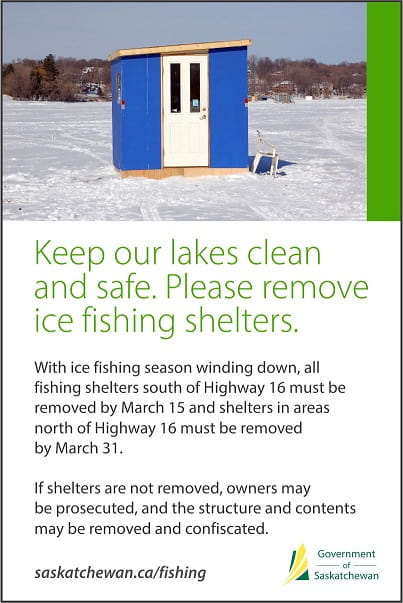 As ice fishing season winds down, anglers are reminded that all fishing shelters south of Highway 16 must be removed by March 15 and shelters in areas north of Highway 16 must be removed by March 31.