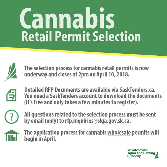 A two-phase selection process will be used to determine the retail operators. The detailed Request for Proposal (RFP) documents related to the retail selection process are available on www.SaskTenders.ca. A free user account is required to download the documents. Questions related to the RFP process must be sent by email to rfp.inquiries@slga.gov.sk.ca. Deadline to respond to the RFP is April 10, 2018 at 2 p.m.
