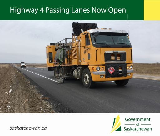 “Driver safety is a top priority for our government,” Highways and Infrastructure Minister Lori Carr said. “Passing lanes can reduce collisions by 25 per cent and this investment in passing lanes on Highway 4 is another example of the priority our government places in roads and infrastructure.”Four passing lanes as well as intersection improvements have been opened to traffic. Work has wrapped up on construction of the initial $10 million project this year, and the contractor will return for additional paving, minor repairs and clean up next spring.