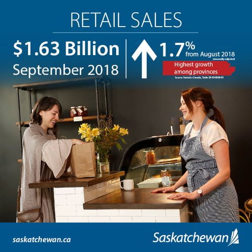 Saskatchewan ranked first in retail sales growth among Canada’s provinces in September 2018, with a 1.7 per cent increase from the previous month and higher than the national average of 0.2 per cent.