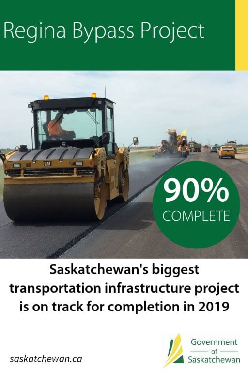 Once complete, the Regina Bypass will allow drivers to safely commute to their destinations on Trans-Canada Highway 1 east of Regina and will reduce congestion in and around the provincial capital. This will lead to reduced collision rates and result in fewer injuries and fatalities.