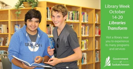 The Government of Saskatchewan has proclaimed October 14-20 as Saskatchewan Library Week to celebrate the contribution libraries make in the lives of residents. This year’s theme is “Libraries Transform” as libraries can open a world of knowledge to their users.