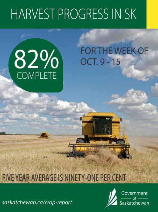 Although wet and cool weather conditions last week continued to delay harvest in much of the province, many producers are back in the field or will be soon. Eighty-two per cent of the crop is now in the bin, according to Saskatchewan Agriculture’s Weekly Crop Report, up from 78 per cent last week, but behind the five-year (2013-2017) average of 91 per cent for this time of year. The warm and dry weather forecast for the next week or more will allow producers to resume combining.