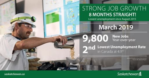 According to a report issued today by Statistics Canada, Saskatchewan’s seasonally adjusted unemployment rate was 4.9 per cent last month, down from 6.0 per cent in March 2018 and 5.8 per cent in February 2019.The unemployment rate was the second lowest in the country and well below the national average of 5.8 per cent. March’s unemployment was the lowest recorded in Saskatchewan since August 2015.
