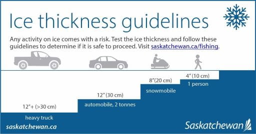 With the arrival of colder temperatures, the Government of Saskatchewan reminds everyone to make sure that ice is safe and thick enough before walking or driving on it. Ice thickness depends on the particular waterbody and the local conditions. It does not freeze at a uniform thickness and ice strength can vary considerably from one area to another.To be sure, check the ice thickness before you travel on it. As a guideline, you need at least 10 cm (four inches) of ice to walk on, 20 cm (eight inches) to drive a snowmobile or ATV on, 30 cm (12 inches) to drive a car or light truck on, and more than 30 cm (12 inches) to support a heavy truck.