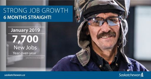 Saskatchewan’s year-over-year employment increased by 7,700 jobs from January 2018. This marks the sixth consecutive month of strong job gains for the province. The job gains were split between full-time and part-time increases, with full-time up 4,400 jobs and part-time up 3,200 jobs. Jobs in the private sector were up 16,200.“Saskatchewan has seen strong job growth for six consecutive months now,” Immigration and Career Training Minister Jeremy Harrison said. “This is an encouraging trend to see in spite of the economic headwinds we have been faced with in recent months. We will continue to work hard and stand up for our province to ensure this positive economic trend continues.”