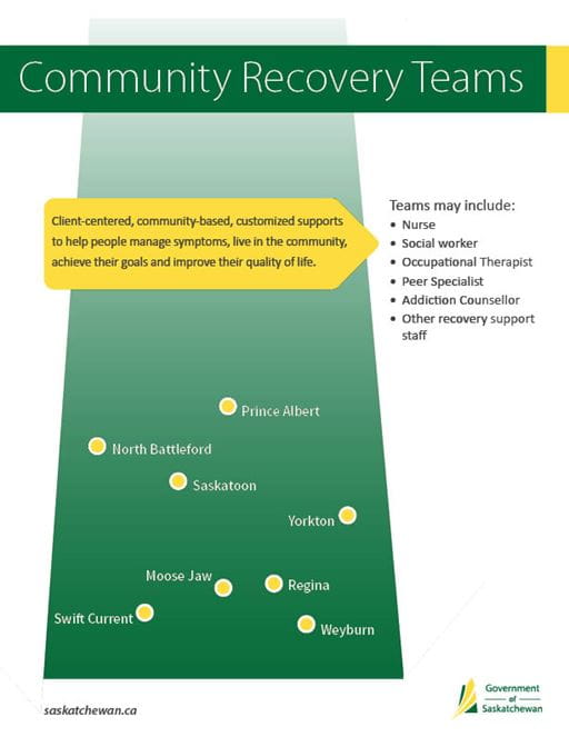 “Community Recovery Teams help clients manage their symptoms and avoid hospitalization by bringing care to them – out in the community,” Corrections and Policing Minister and Regina Wascana Plains MLA Christine Tell said. “This is an important step forward in our government’s commitment to improving mental health services.”