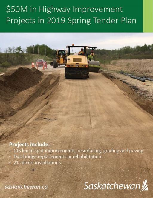 The Government of Saskatchewan has released its 2019 Spring Tender schedule, which lists more than $50 million worth of highway improvement and safety projects that will be tendered in the next several weeks. This is in addition to more than $250 million worth of construction announced in the Fall Tender Plan, released last September.The 11 projects include more than 110 km in resurfacing, grading and paving, spot improvements, two bridge replacements or rehabilitations, and 21 culvert installations.