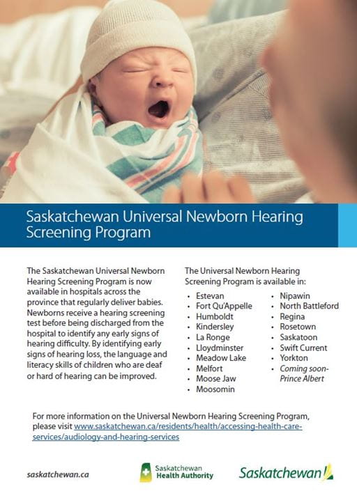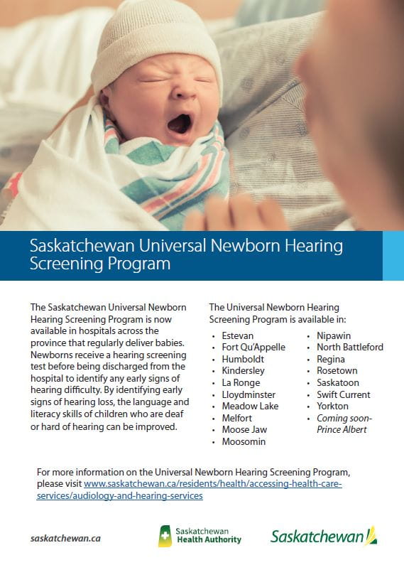 For more information about the Universal Newborn Hearing Screening Program, including the hospitals that offer it, visit www.saskatchewan.ca/residents/health/accessing-health-care-services/audiology-and-hearing-services.