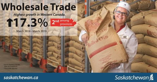 Saskatchewan led Western Canada and ranked second among provinces in year-over-year wholesale trade growth according to Statistics Canada.Wholesale trade was up 17.3 per cent (seasonally adjusted) in March 2019 when compared to last March, the second highest percentage increase among the provinces. Nationally, trade increased by 2.8 per cent.