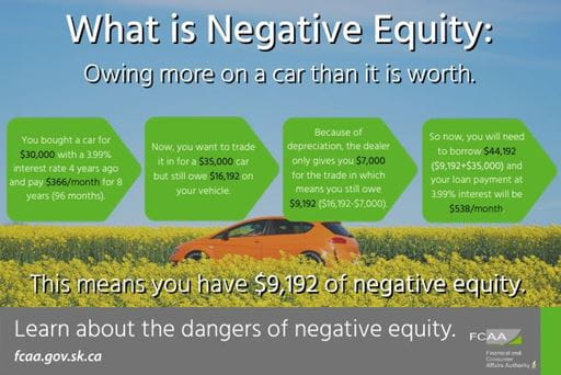 For more information about negative equity visit https://fcaa.gov.sk.ca/consumers-investors-pension-plan-members/consumers/consumers-of-goods-and-services/purchasing-and-repairing-a-vehicle/negative-equity.