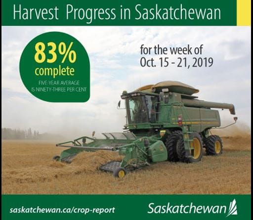Many producers were able to continue with harvest operations last week as 83 per cent of the crop is now in the bin. This is up from 69 per cent last week but remains behind the five-year (2014-18) average of 93 per cent for this time of year.