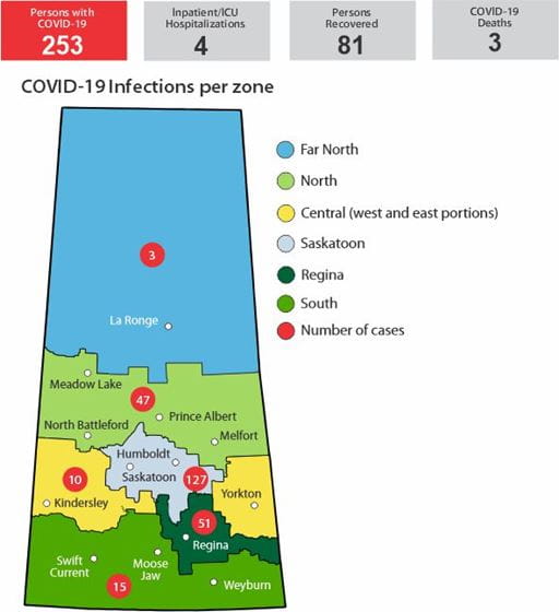 As of April 6, 2020, Saskatchewan has four new, confirmed cases of COVID-19, bringing the provincial total to 253. One hundred and sixty-nine of the cases are considered active.