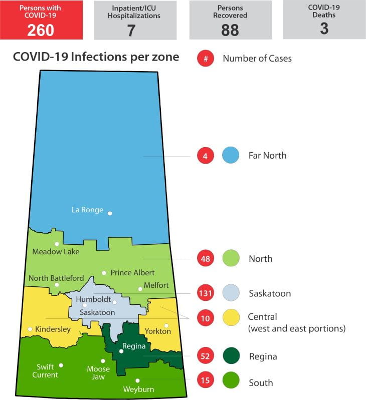 Seven more people have recovered, bringing the provincial total to 88. Currently, there are seven people hospitalized in the province from COVID-19. Five people are receiving inpatient care – four in Saskatoon and one in Regina – while there is also one person in the intensive care unit in Saskatoon and one in Regina.