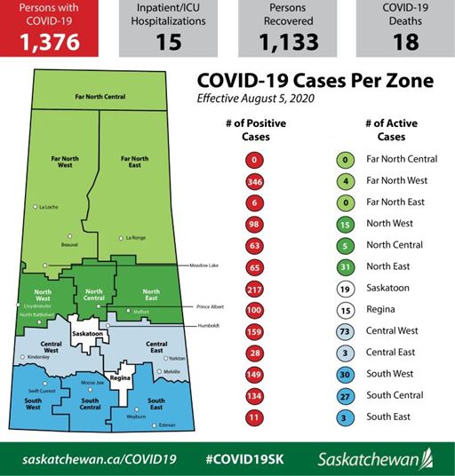 - 352 cases are from the far north zone (346 far north west, 0 far north central, 6 far north east), 294 cases are from the south zone (149 south west, 134 south central, 11 south east), 217 cases are from the Saskatoon zone, 226 cases are from the north zone (98 north west, 63 north central, 65 north east), 187 cases are from the central zone (159 central west, 28 central east) and 100 cases are from the Regina zone.