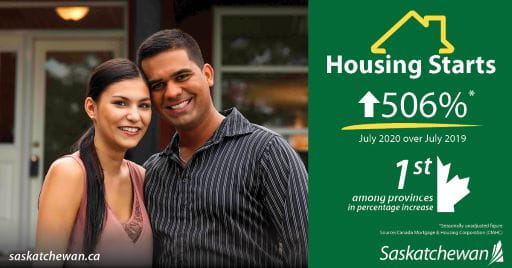 Urban housing starts in July in Saskatchewan increased by 506 per cent, compared to July 2019, which was the highest percentage increase among the provinces.