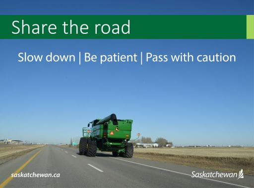 With harvest underway, please be aware of slower moving farm machinery on provincial highways.
