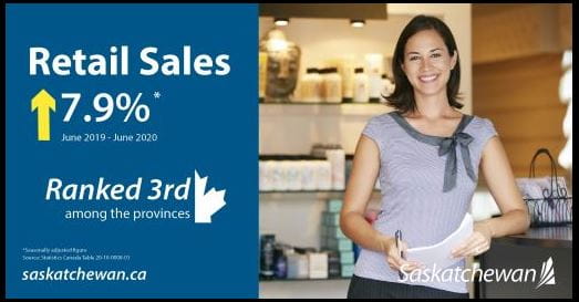 The value of retail sales in Saskatchewan increased 7.9 per cent in June 2020 (compared to June 2019), which was the third highest percentage increase compared to the other provinces, and more than double the 3.8 per cent increase posted for Canada (seasonally adjusted).