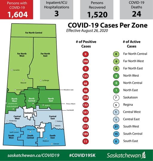 There are three new cases of COVID-19 to report in Saskatchewan on August 26. This brings the total to 1,604 reported cases. All three new cases are in Saskatoon.