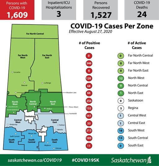 There are five new cases of COVID-19 to report in Saskatchewan on August 27. This brings the total to 1,609 reported cases. The new cases are in the North West (3) and Saskatoon (2) zones.