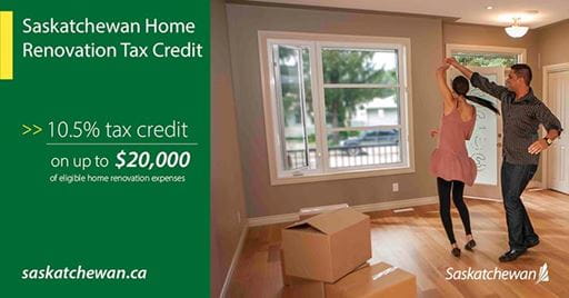 Under this non-refundable tax credit, Saskatchewan homeowners may save up to $2,100 in provincial income tax by claiming a 10.5 per cent tax credit on up to $20,000 of eligible home renovation expenses.  Eligible expenses include the cost of labour and professional services, building materials, fixtures, equipment rentals and permits.