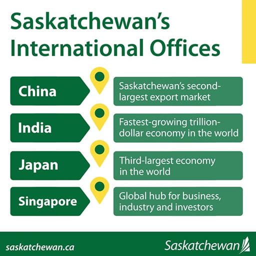 “Strong economic recovery will require a strong international presence and these offices will strengthen our trade relationships and help us bring safe, secure Saskatchewan products to the world,” Trade and Export Development Minister Jeremy Harrison said. “Led by a team with considerable international experience, these offices will play a critical role in helping us strengthen trade relationships, support Saskatchewan businesses, grow our exports and attract new investment into our province.”
