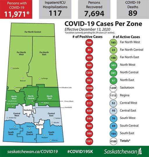 There are 222 new cases of COVID-19 to report in Saskatchewan on December 13, 2020, bringing the provincial total to date to 11,971 cases.