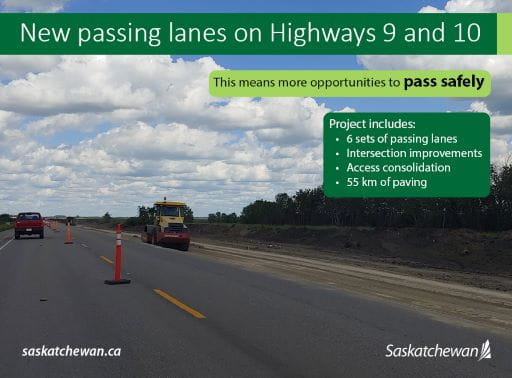 “Our government is committed to building strong communities by investing in highways and infrastructure,” Highways and Infrastructure Minister Greg Ottenbreit said. “The new passing lanes on Highways 9 and 10 will improve traffic flow and safety while helping transport our commodities from production to market.”