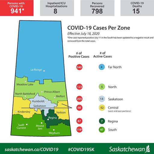 There are six new cases of COVID-19 to report in Saskatchewan on July 18, bringing the total to 941 cases. The new cases are located in the North (1), Central (1), South (3) and Saskatoon (1) regions.