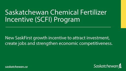 Today, the Government of Saskatchewan launched the Saskatchewan Chemical Fertilizer Incentive (SCFI) program. A SaskFirst new growth tax incentive, the SCFI program will help attract new capital investments in large-scale chemical fertilizer production facilities in Saskatchewan, while creating new construction and operational jobs in the province.